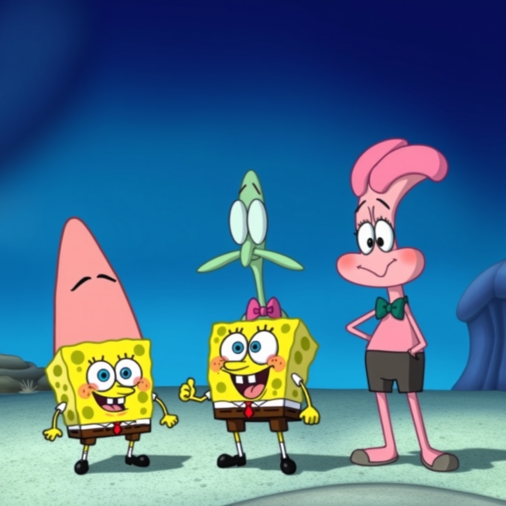 عکس باب اسفنجی همراه پاتریک و اختاپوس و آقای خرچنگ و سندی در فیلم باب اسفنجی