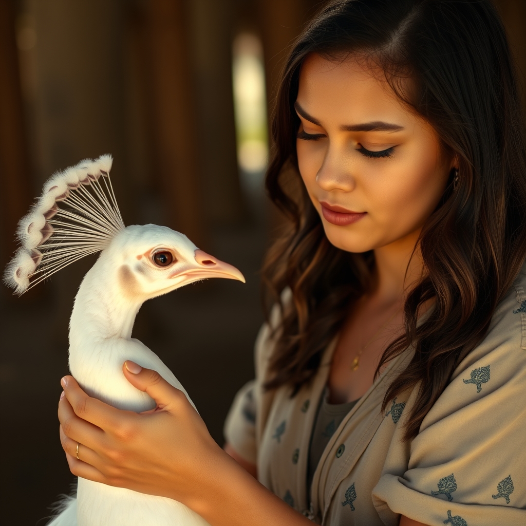 جنا اورتگا با گوهانی سفید و تور توری در حال ناز کردن یک طاووس سفید